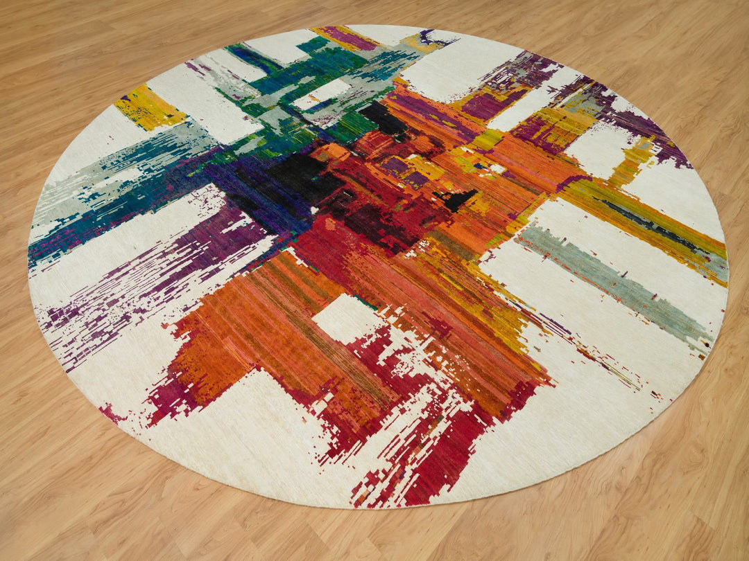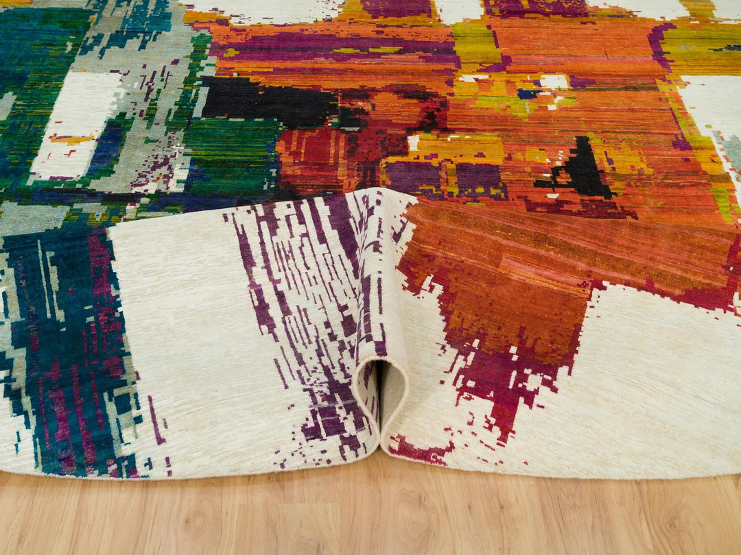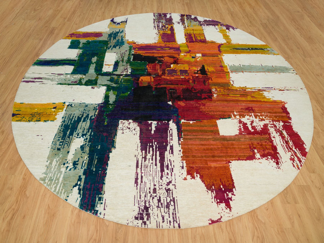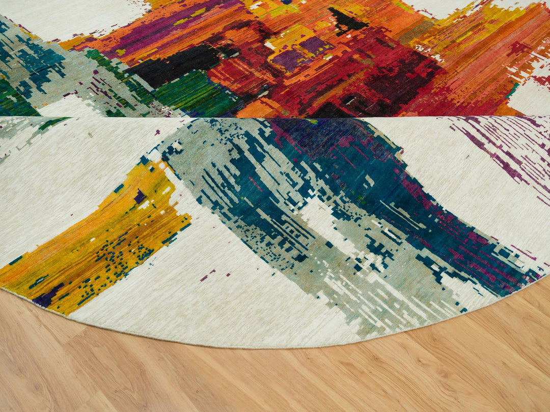 13'8" x 13'8" New Hand Knotted Ivory Wool & Silk Round Oriental Rug - MOA10290265