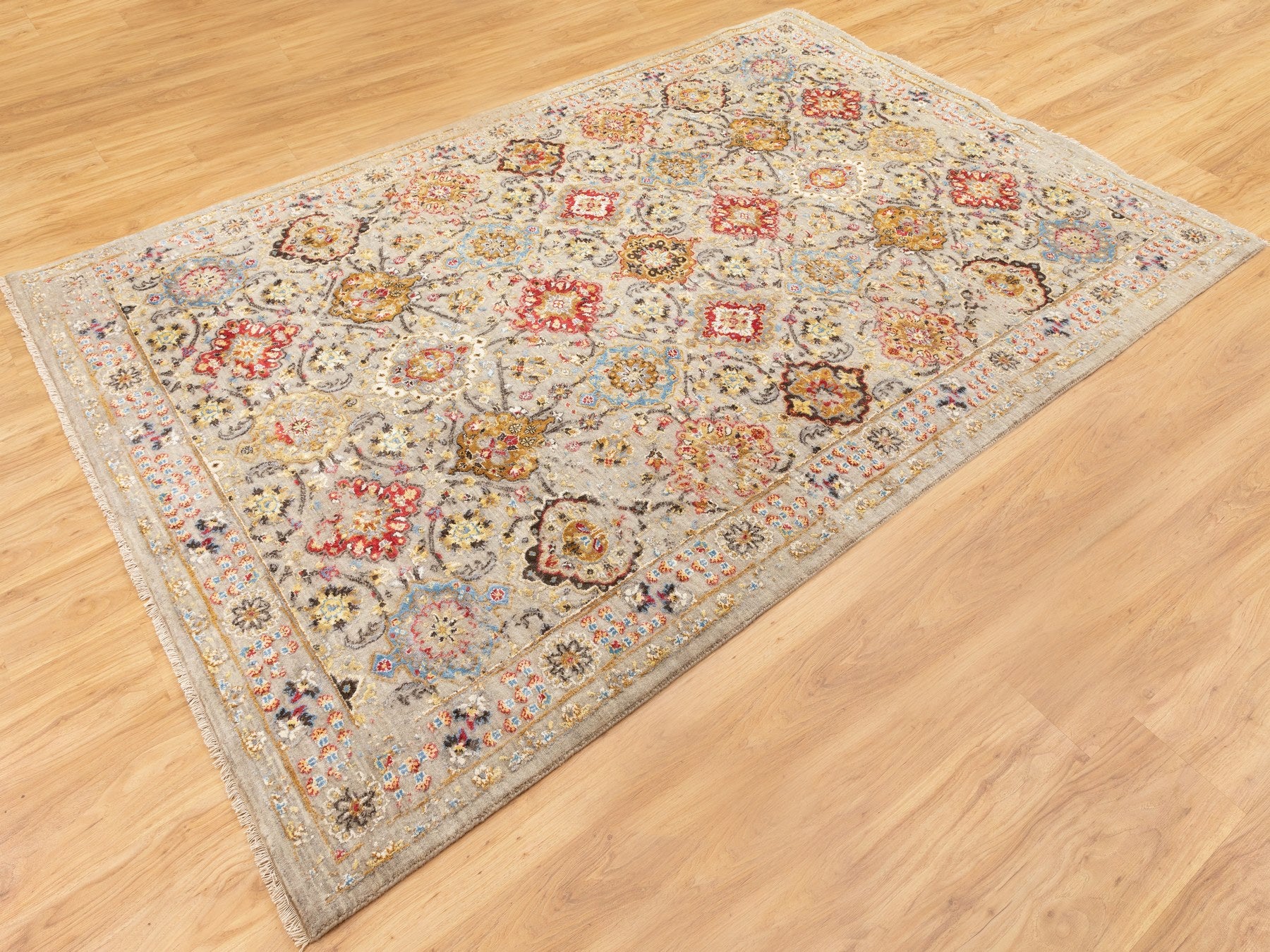 6'1" x 9'0" New Hand Knotted Grey Wool & Pure Silk Rectangle Oriental Rug - MOA10258443