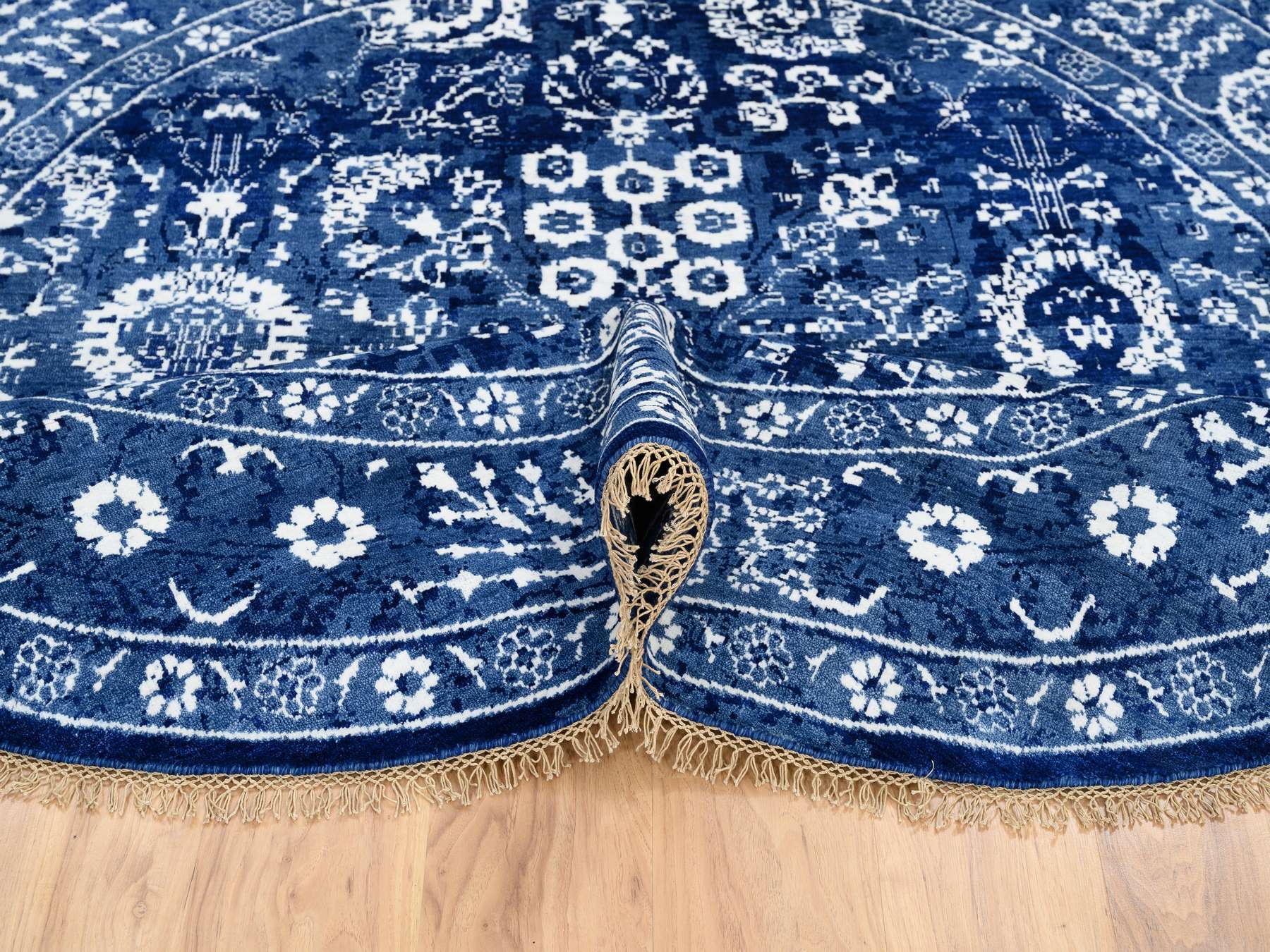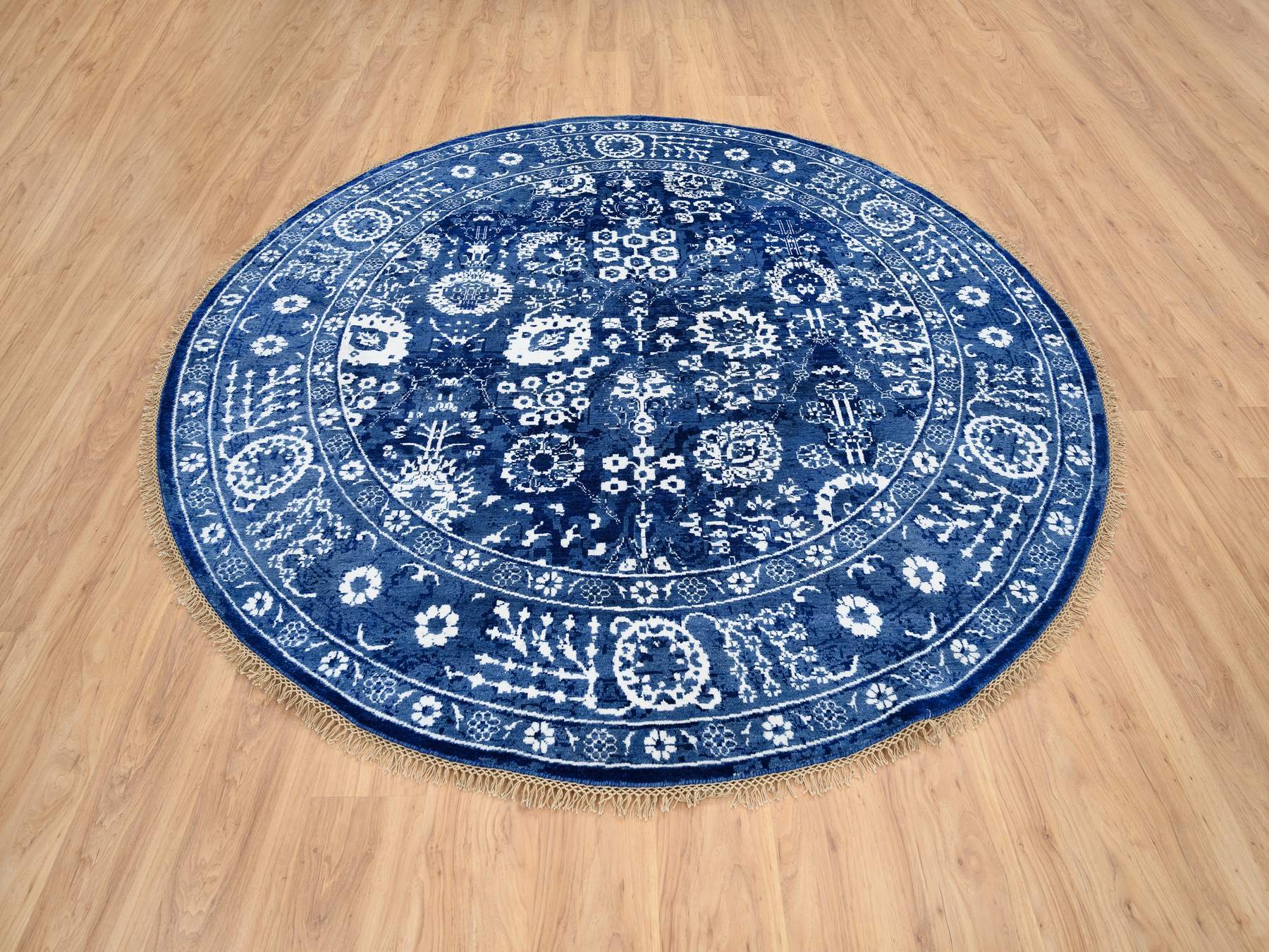 8'2" x 8'2" New Hand Knotted Blue Wool & Silk Round Oriental Rug - MOA10264849