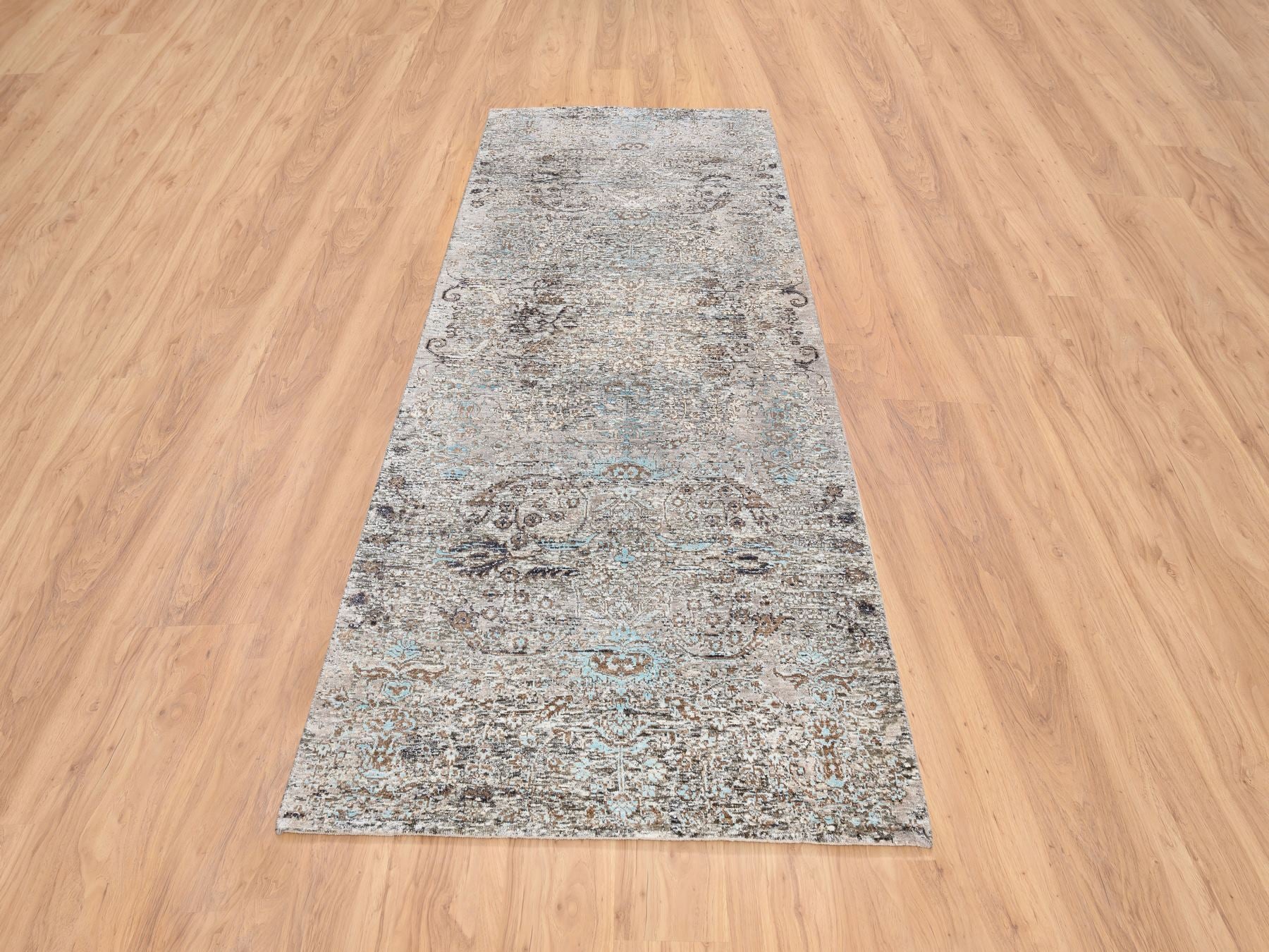 4'0" x 10'0" New Hand Knotted Grey Wool & Silk Runner Oriental Rug - MOA10264451